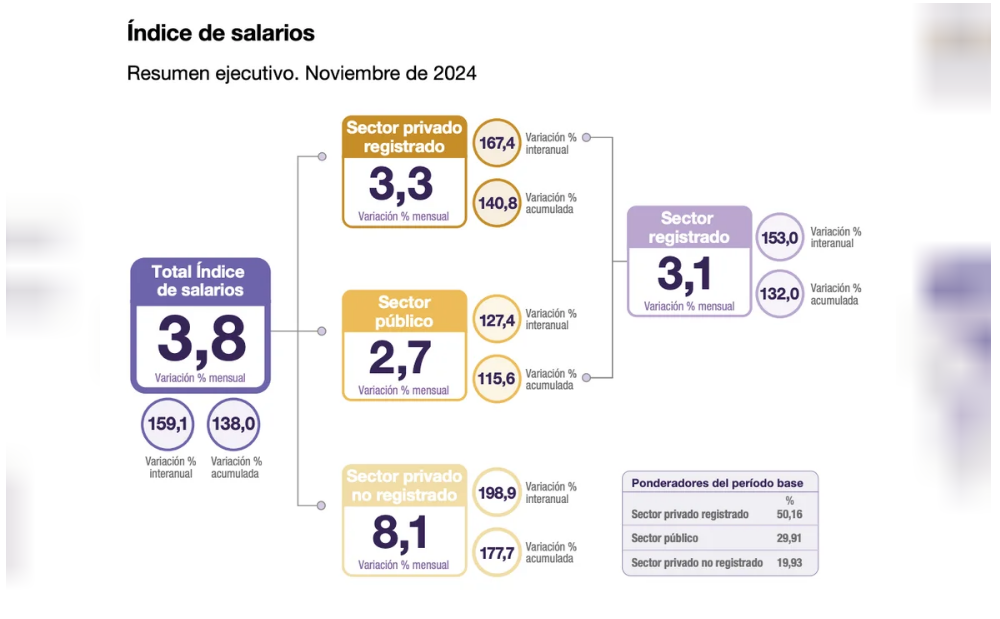 Para noviembre de 2024 el índice de salarios acumuló una suba de 138% respecto de diciembre del año previo, debido a subas de 140,8% en el sector privado registrado, 115,6% en el sector público y 177,7% en el sector privado no registrado.