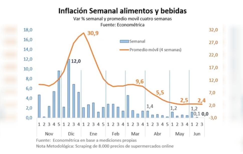 El informe detalló que el rubro alimentos y bebidas tuvo un aumento del 0,1% en los últimos quince días, al exhibir una suba de una décima en la segunda semana del sexto mes del año y no registrar variaciones (0,0%) en la tercera semana.
