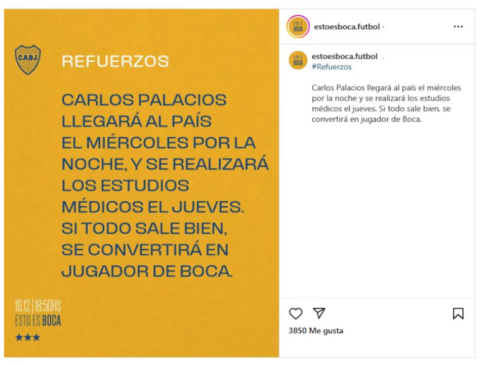 “Carlos Palacios llegará al país el miércoles por la noche y se realizará los estudios médicos el jueves. Si todo sale bien, se convertirá en jugador de Boca”, fue el anuncio que el club argentino compartió a través de sus redes sociales Esto Es Boca donde suele brindar información acerca del mercado de pases. La llegada de Palacios fue un tema que mantuvo en vilo desde hace varios mercados de pases al Consejo de Fútbol, en especial al presidente Juan Román Riquelme, quien días atrás había insinuado su incorporación.