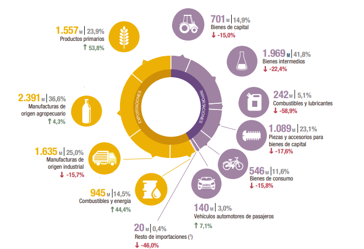 En cuanto a importaciones, todos los rubros principales cayeron, excepto el sector de vehículos automotores, que aumentó en 717 millones de dólares. Los combustibles y lubricantes bajaron un 65%, y los bienes intermedios, de capital y de consumo disminuyeron un 21.5%, 21.2% y 15.5% respectivamente.