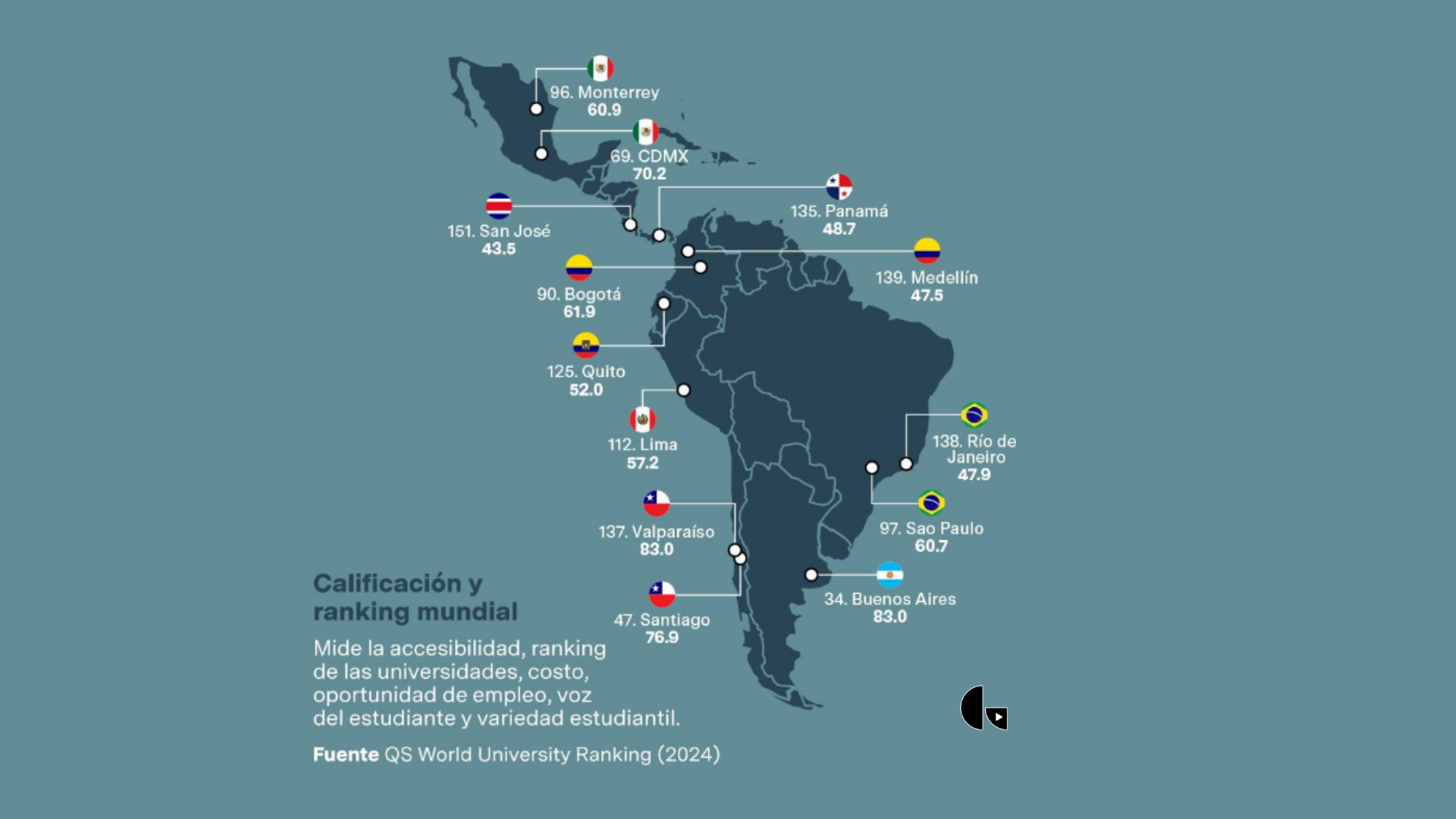 De acuerdo con sus resultados, la mejor ciudad latinoamericana para estudiar es Buenos Aires, en Argentina, (34 a nivel mundial).