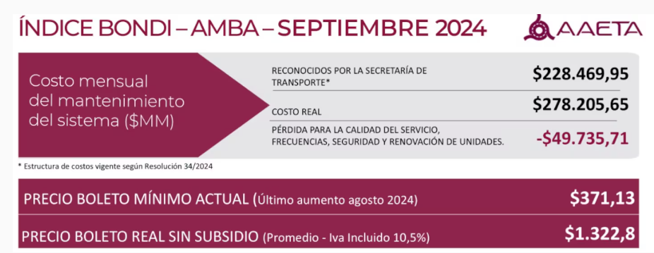 Este valor implica una diferencia de 259,24% o $961,67 con respecto al boleto mínimo de $371,13 que se paga hoy en el CABA y el conurbano bonaerense. Mientras en agosto el boleto sin subsidios alcanzaba los $1272,80, es decir, una alza de $60 para el cálculo de septiembre.