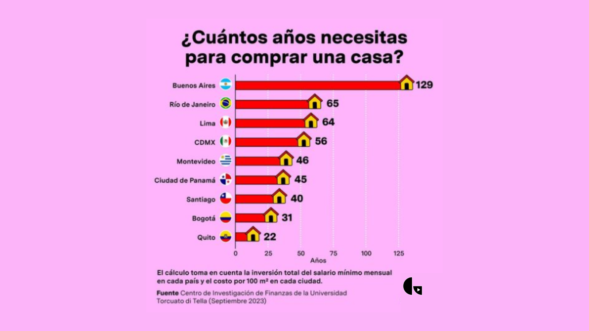 En el caso de Buenos Aires, tomaría por lo menos 129 años de ahorro del 100% del salario mínimo para comprar un inmueble de estas características. Encontrándonos en el podio del ranking.