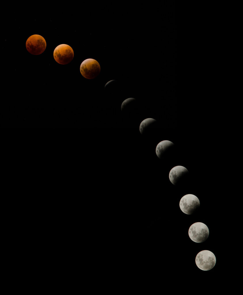Una parte de la Luna se oscurece durante el proceso del eclipse, además de que puede que tome un color rojizo producto de que la atmósfera terrestre absorbe los demás colores mientras se dobla algo de luz solar hacia la Luna.