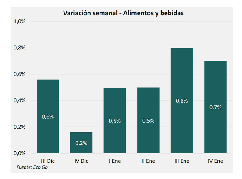 De esa forma, la proyección de IPC para el primer mes del año sería de 2,3% mensual. “El dato es todavía preliminar y está sujeto a modificaciones. La corrección al alza de la proyección responde a un aumento en alimentos mayor al esperado, la publicación de los datos del índice de costos de la construcción, donde la categoría ‘mano de obra’ registró un aumento del 17,6%, y subas en cigarrillos”, aclaró EcoGo.