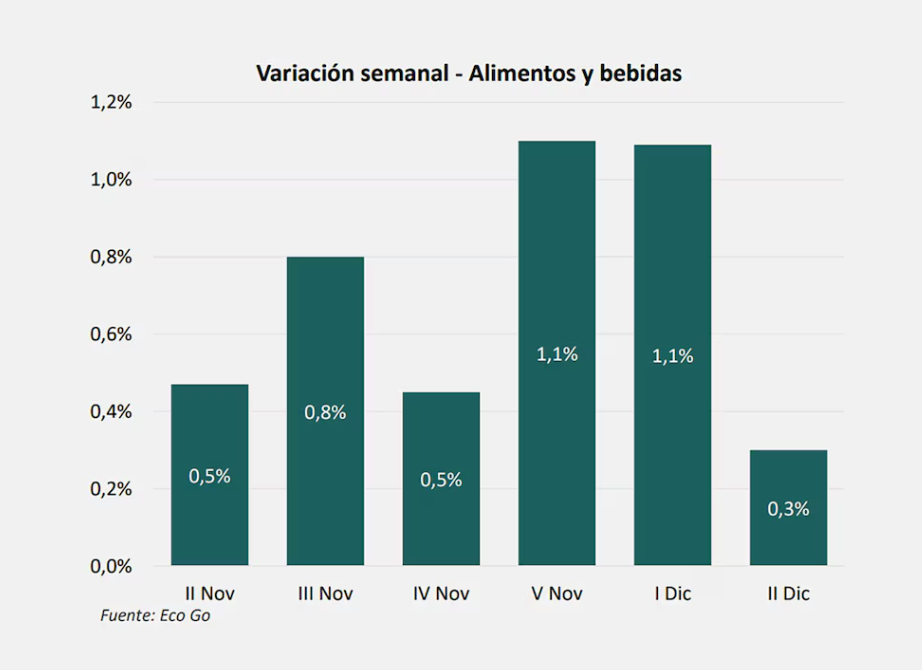 EcoGo aseguró que en la segunda semana de diciembre “los alimentos registraron un incremento del 0,3%, marcando un fuerte descenso respecto a las dos semanas previas”