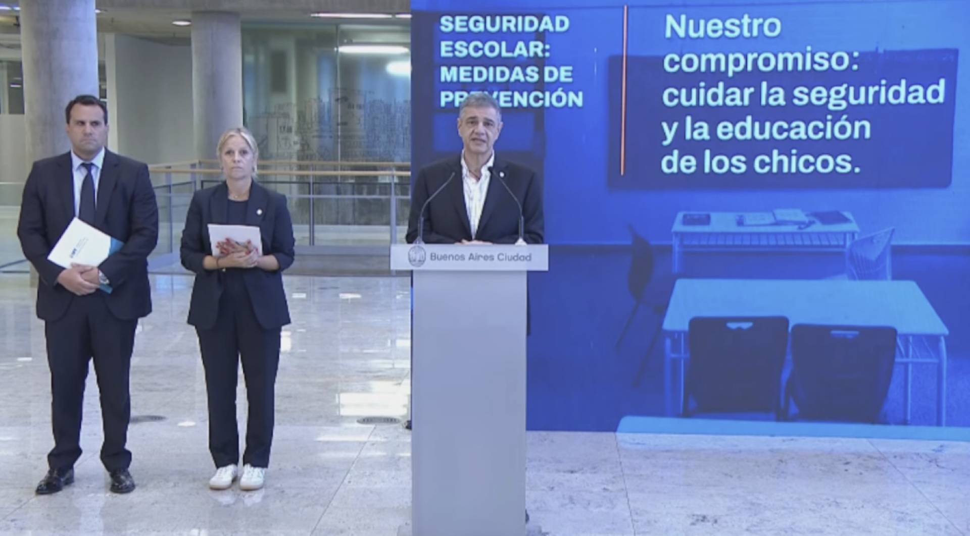“En tres hechos concretos las amenazas derivaron en operativos policiales, incluso uno fuera de la Ciudad. En todos los casos la Justicia sigue investigando los hechos y la responsabilidad de los alumnos y los padres. Nosotros intensificamos las medidas de supervisión en todas las escuelas y reforzamos el cuidado de la convivencia”, agregó Jorge Macri, junto a la ministra de Educación, Mercedes Miguel, y al fiscal general, Martín López Zavaleta. Lo acompañaron el Jefe de Gabinete, Gabriel Sánchez Zinny; el ministro de Seguridad, Horacio Giménez; el de Justicia, Gabino Tapia; y el de Salud, Fernán Quirós. Además, la presidente del Consejo de la Magistratura, Karina Leguizamon; Javier Bujan, Presidente de la Cámara Penal; Carolina Stanley, titular del Ministerio Público Tutelar; y Victoria Morales Gorleri, presidente del Consejo de los Derechos de Niñas, Niños y Adolescentes, junto a otros funcionarios del Poder Judicial, diputados por la Ciudad, representantes de escuelas privadas e integrantes de la comunidad educativa.