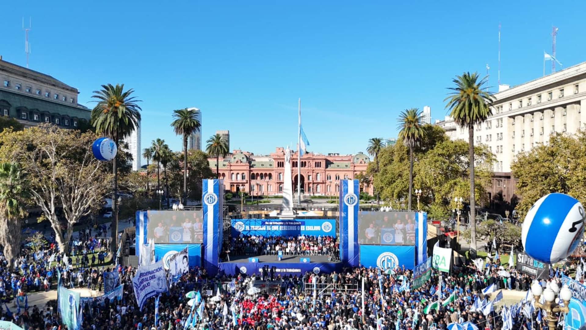 La Confederación General del Trabajo (CGT) se movilizó este jueves a Plaza de Mayo en la víspera del Día del Trabajador y realizó un acto, encabezado por los integrantes del triunvirato de la central obrera, Jorge Sola, Cristian Jerónimo y Octavio Argüello, en el que se formularon críticas al Gobierno, pero sin convocar a un paro.