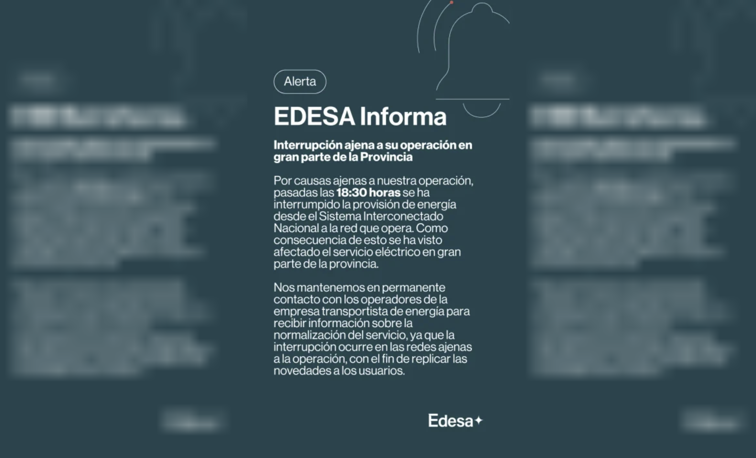 La empresa distribuidora EDESA confirmó que el problema se originó en el Sistema Interconectado Nacional (SIN), ajeno a su operación. “Pasadas las 18:30 horas se ha interrumpido la provisión de energía desde el SIN a la red que opera EDESA”, señalaron en un comunicado. Y agregaron que como consecuencia de esta situación, “se ha visto afectado el servicio eléctrico en gran parte de la provincia”.