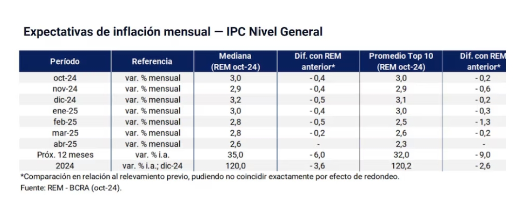 Según los especialistas que consulta el Banco Central (BCRA) en su Relevamiento de Expectativas de Mercado (REM), la inflación perforará el piso del 3% en noviembre (2,9%) y terminará el 2024 en un valor del 120%. Esto implica una notable corrección a la baja de los valores proyectados en las ediciones anteriores del estudio. Sin ir más lejos, en el REM anterior se hablaba de un IPC cerrando el 2024 en 123,6%.