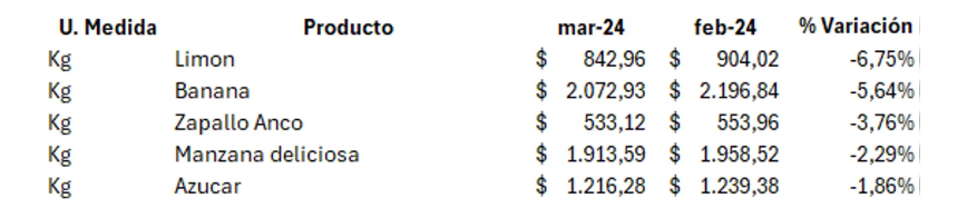 La buena noticia viene para la gente que le gusta aderezar la ensalada con limón, porque fue el alimento que registró la mayor baja del mes con una caída en su precio de 6,75% a $842,96 el kilo. La banana le siguió con un descenso de 5,64% y el zapallo anco por kilo bajando un 3,76% su valor.