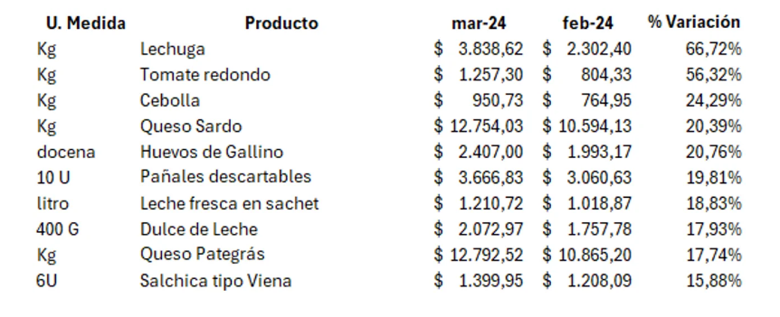 Dentro de los alimentos que más aumentaron se encuentran los ingredientes de la famosa ensalada mixta, que durante marzo fue de lo más caro para acompañar las comidas. Por las lluvias y las inclemencias climáticas la lechuga aumentó un 66,72% hasta los $3838,62 por kilo. Por su parte el tomate redondo, tuvo un incremento del 56,32% al venderse el kilo en un promedio de $1257,30. Para completar la ensalada, la cebolla aumentó un 24,3% completando el podio de las mayores subas.